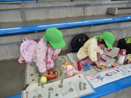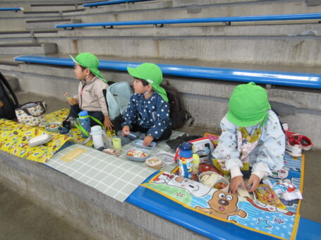 今日は初めていちごぐみさんだけでのおでかけ。しかも園外で初めてお弁当を食べました。