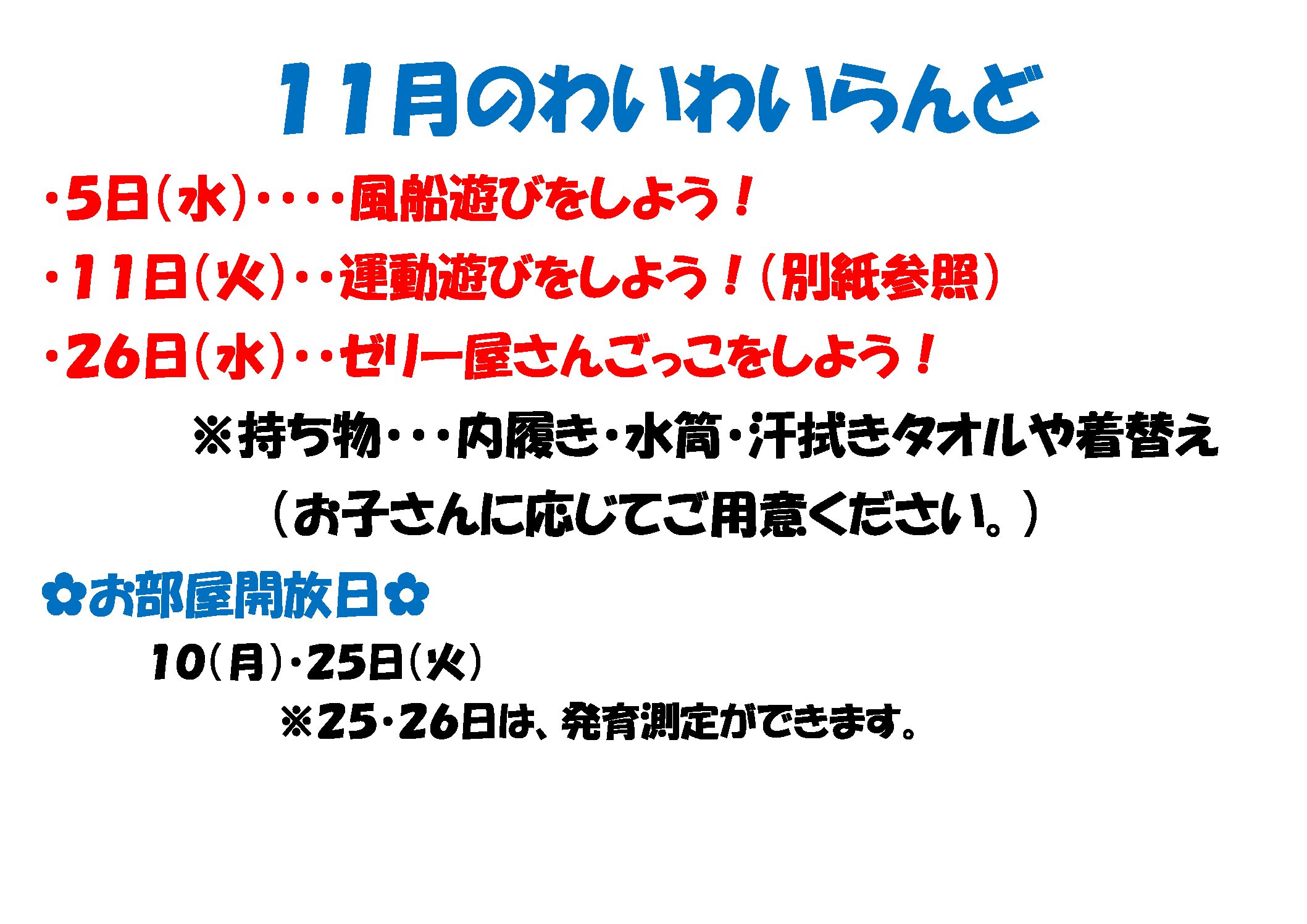 11月のわいわいらんどの予定です。みなさんのご利用お待ちしております!